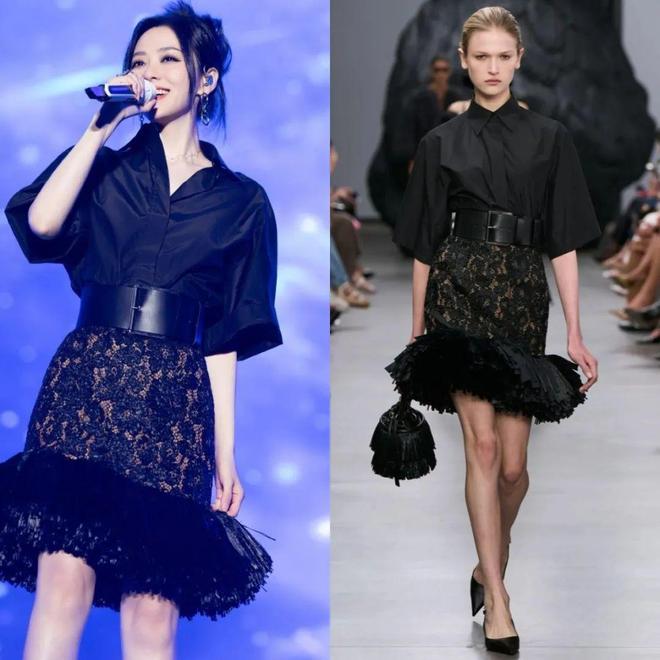 张靓颖,阜阳群星演唱会。黑色中袖衬衣、蕾丝流苏半身裙:Michael Kors 2025春夏系列。
