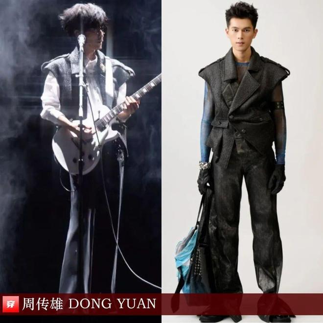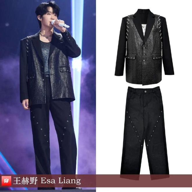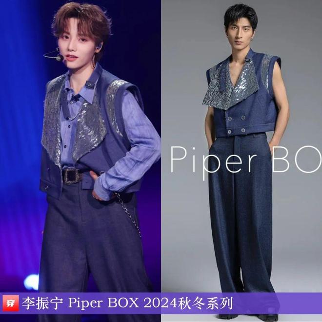 李振宁,《百分百歌手》对战季。亮片拼接蓝色双排扣马甲、蓝色阔腿裤:Piper BOX 2024秋冬系列。
