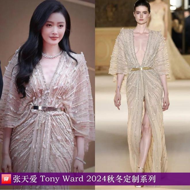 张天爱,第20届中国电影华表奖颁奖活动。米色深V亮片刺绣连衣裙:Tony Ward 2024秋冬定制系列。