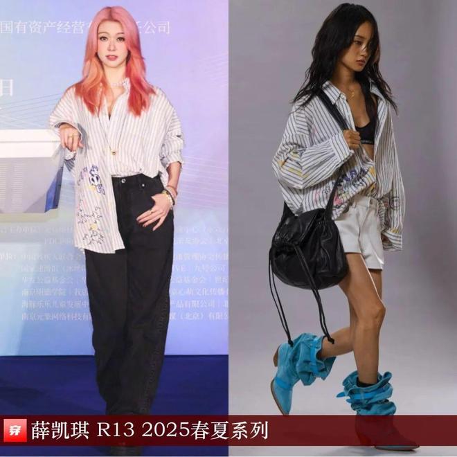 薛凯琪,2025“点亮蓝灯”关爱孤独症公益行动。白色涂鸦条纹长袖衬衣:R13 2025春夏系列。