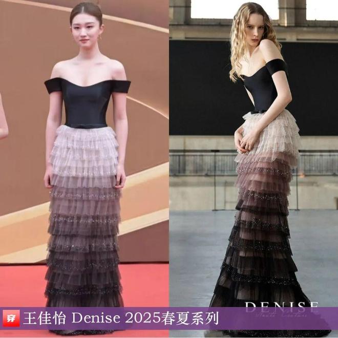 王佳怡,第20届中国电影华表奖颁奖活动。渐变拼接层叠钉珠一字肩礼服:Denise 2025春夏系列。