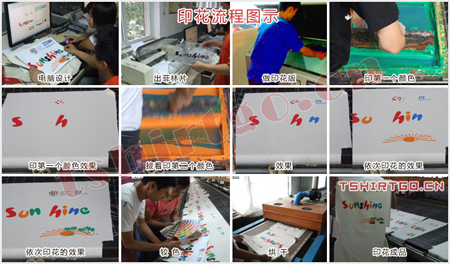 ,如果一件T恤的图案分为红,黄,蓝三个颜色,那就需要印制三个版,每个颜色一个版。丝网印花主要可分为:水浆印花,胶浆印花,油墨印花。丝网印花通过添加入一些特殊材料,会产生