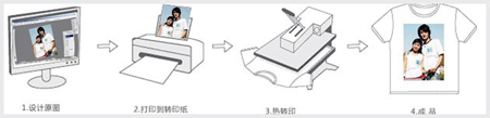 热转印印花是这几年风行的一种印花技术,就是先将图案打印(印刷)到转印纸上,再通过高温高压把图案印在T恤面料上,相对丝网印花来说,转移印花有迅速便捷,色彩逼真的优点,