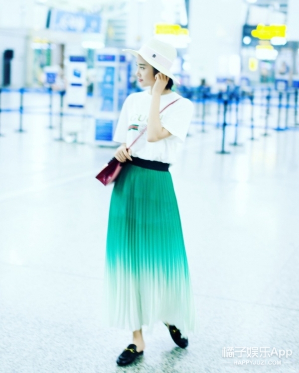唐艺昕穿白色logo印花T恤搭配绿色渐变百褶半身裙,脚踩黑色拖鞋,笑容满分的她又双叒叕在机场走起了清新度假风!