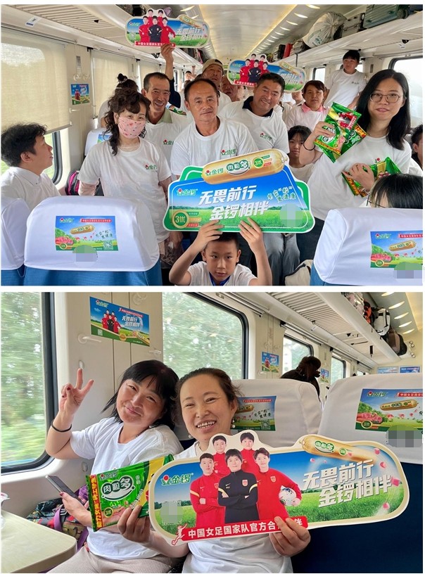 金锣集团与中国普铁的结合,是民族品牌与历史车轮的高度融合。中国普铁的岁月情怀与时代传承,为金锣民族品牌注入了新的品牌内涵与活力。普铁广泛的覆盖力、庞大的客流量、精准的区域渗透能力及独特的场景营销等优势也推动着金锣品牌价值、美誉度、影响力的跃升!“金锣集团”冠名列车通过车贴、海报、展板、枕套、播音多种媒体形式,全方位、立体化展现了金锣与中国国家女子足球队共进相伴、无畏前行的精神,将金锣品牌理念、品牌温度传递给每一位乘客,助推金锣肉粒多加速走进大众视野,让更多乘客带上金锣去旅行!