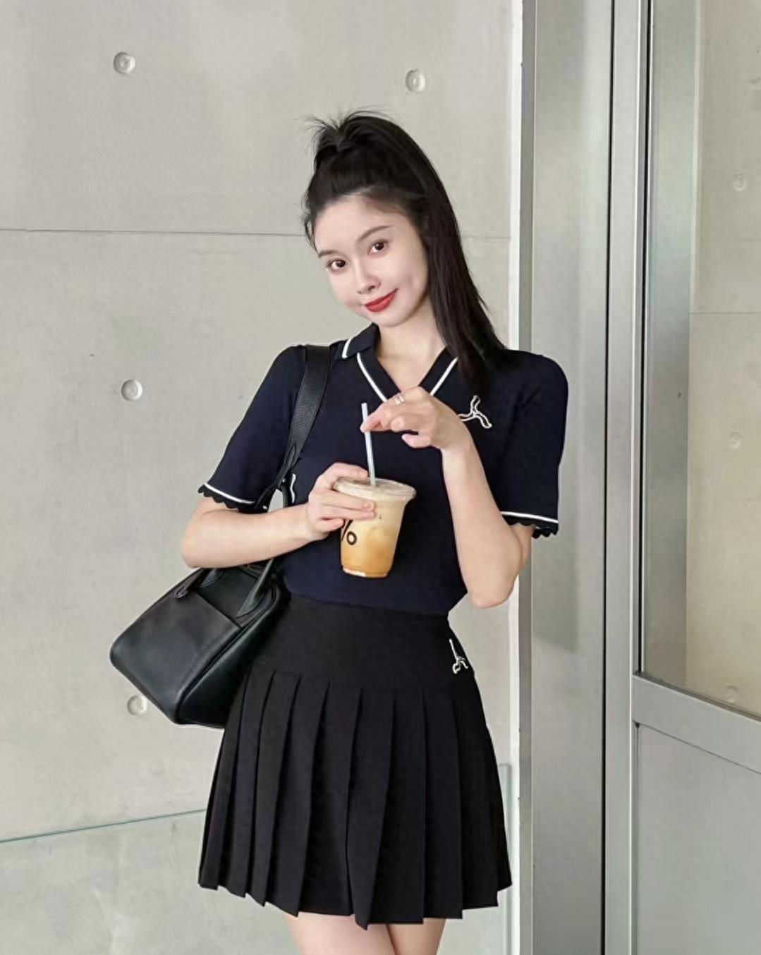 由薄薄的白色面料制成的 Polo 衫搭配黑色裙子。平静的色调结合在一起,表达出女性柔和、平和的本质。穿舒适的慢跑鞋适应现代都市生活。