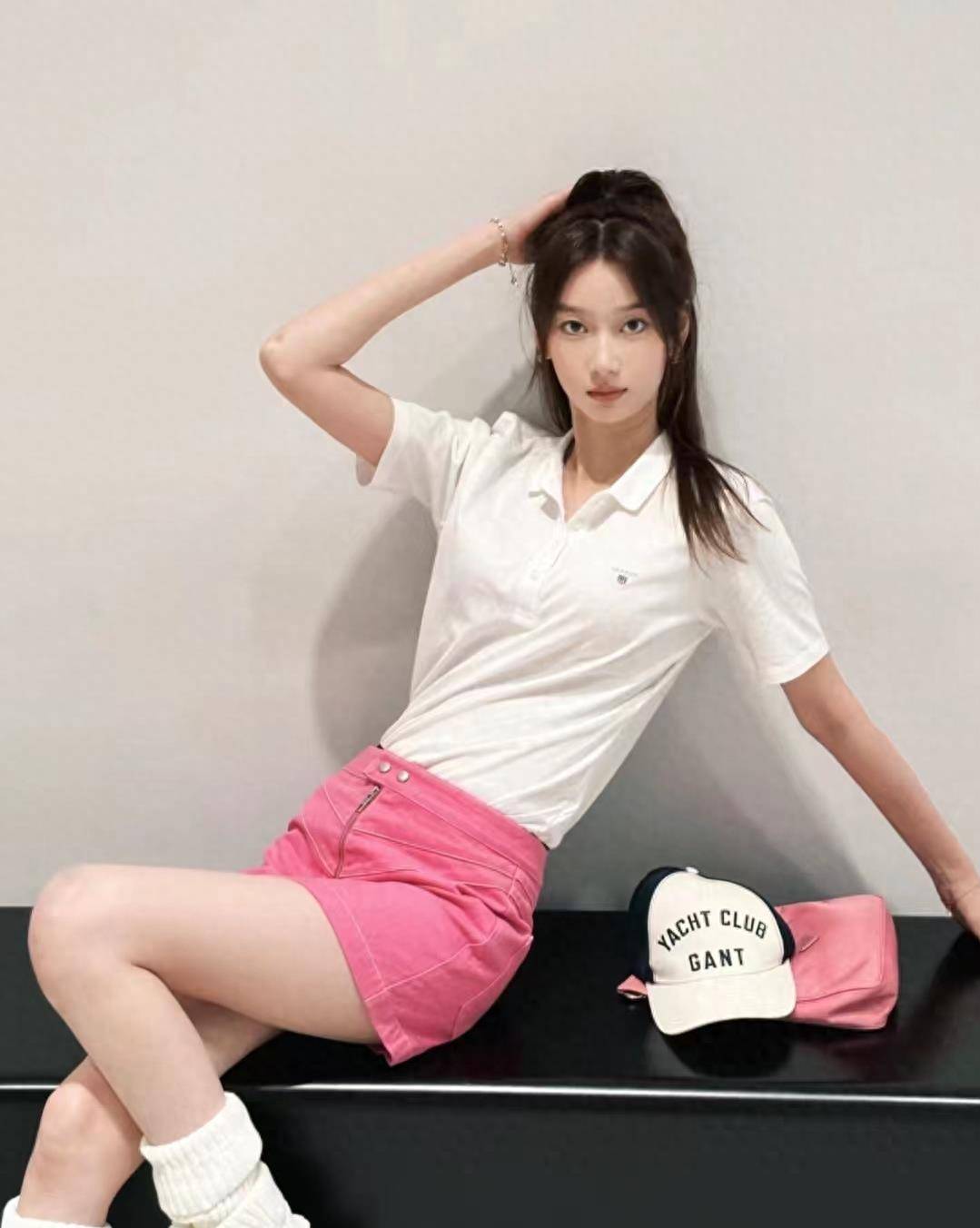 炎热的夏天怎么能少了粉色呢?粉色Polo搭配白色短裤(一定要选择膝盖以上的短裤,不然会更短)。配饰为黑色皮鞋和白色披肩。简单的组合看起来干净又高品质。