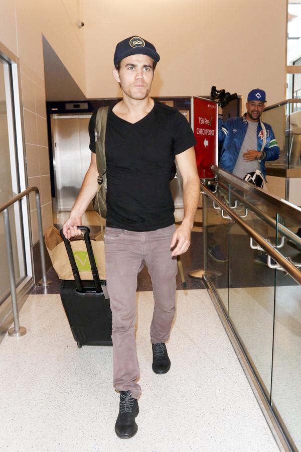 穿着黑色T恤和黑色裤子也能穿出时尚感,像图中模特一样,穿上简约的款式,配上黑色的皮鞋,再配一个黑色的手链,十分帅气。
