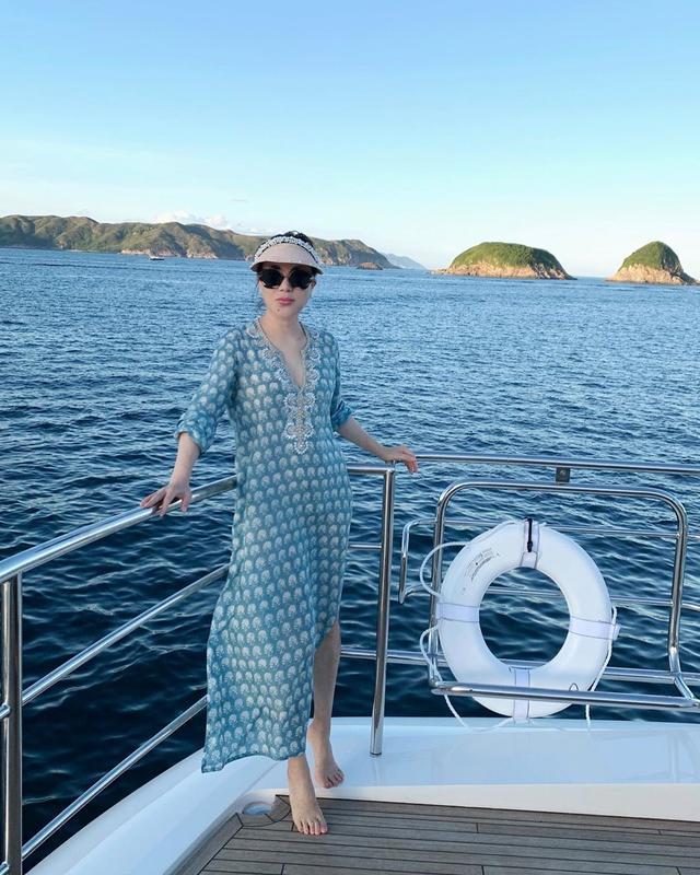 而吕良伟的妻子杨小娟同样是身材超级苗条。她穿着蓝色的纱裙,被轻柔的包裹着,蓝色与大海的蓝色融为一体,非常飘逸自在。领口的位置也是大V领,还加上了花边的装饰,既显脸小,又增加了雍容的气度。
