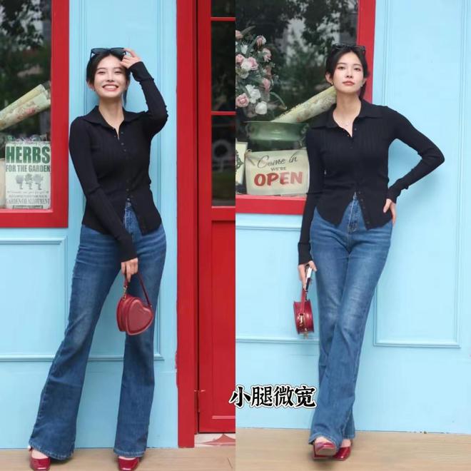 修身的黑色polo衫,配上高腰的微喇牛仔裤,简简单单的就很显高。如果你想要大长腿的效果,可以配一双高跟鞋,充分拉伸比例显腿长。