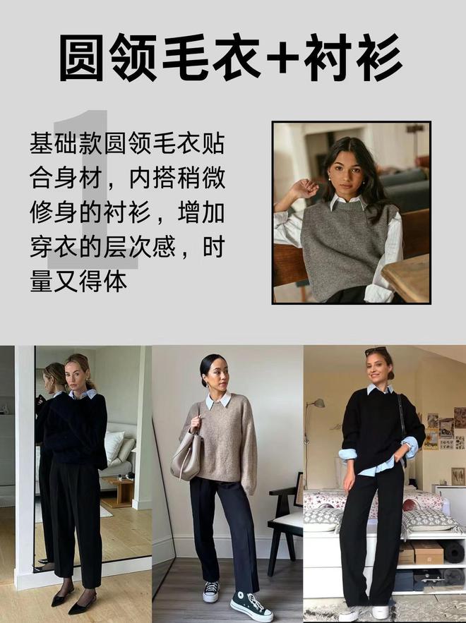 基础款的圆领毛衣,相对修身的款式,可以配更合身一点的衬衫。衬衫作为内搭,可以丰富层次感,时髦又得体,上班通勤也很有范。