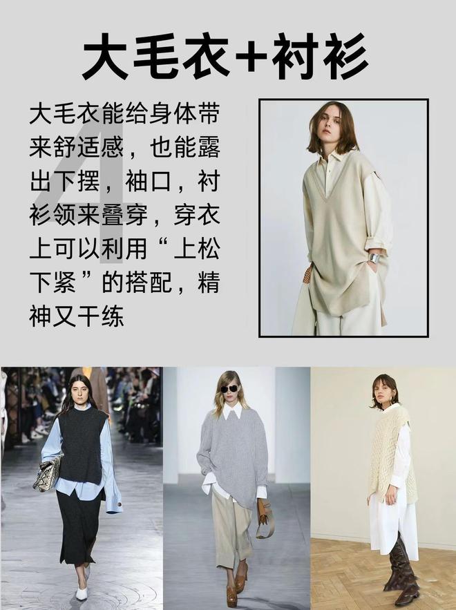 不管是大毛衣、还是大马甲,都应该秉承上松下紧的搭配,精神有干练。内搭白衬衫,也可以选择稍微宽松的大版型,更时髦洒脱。
