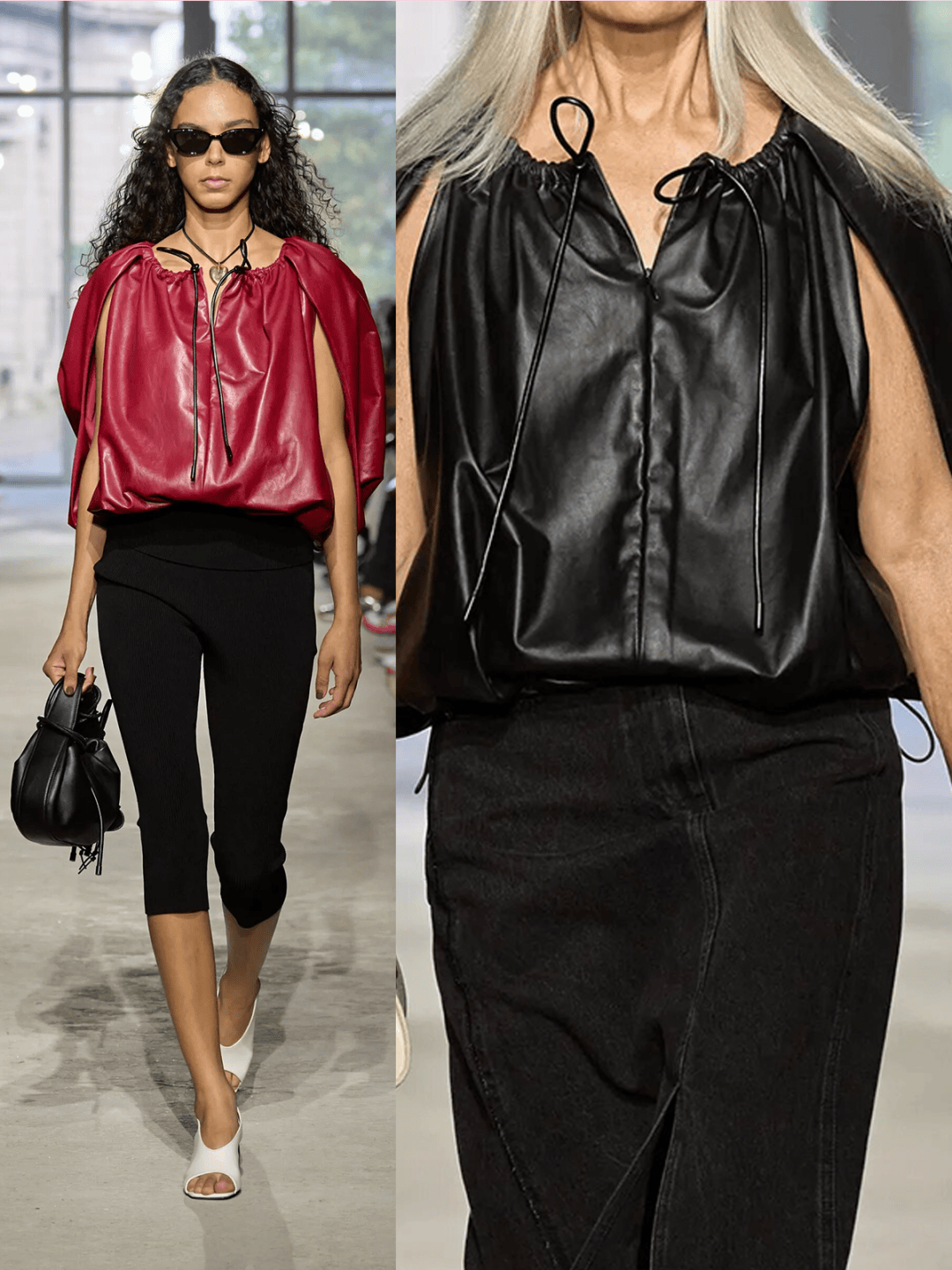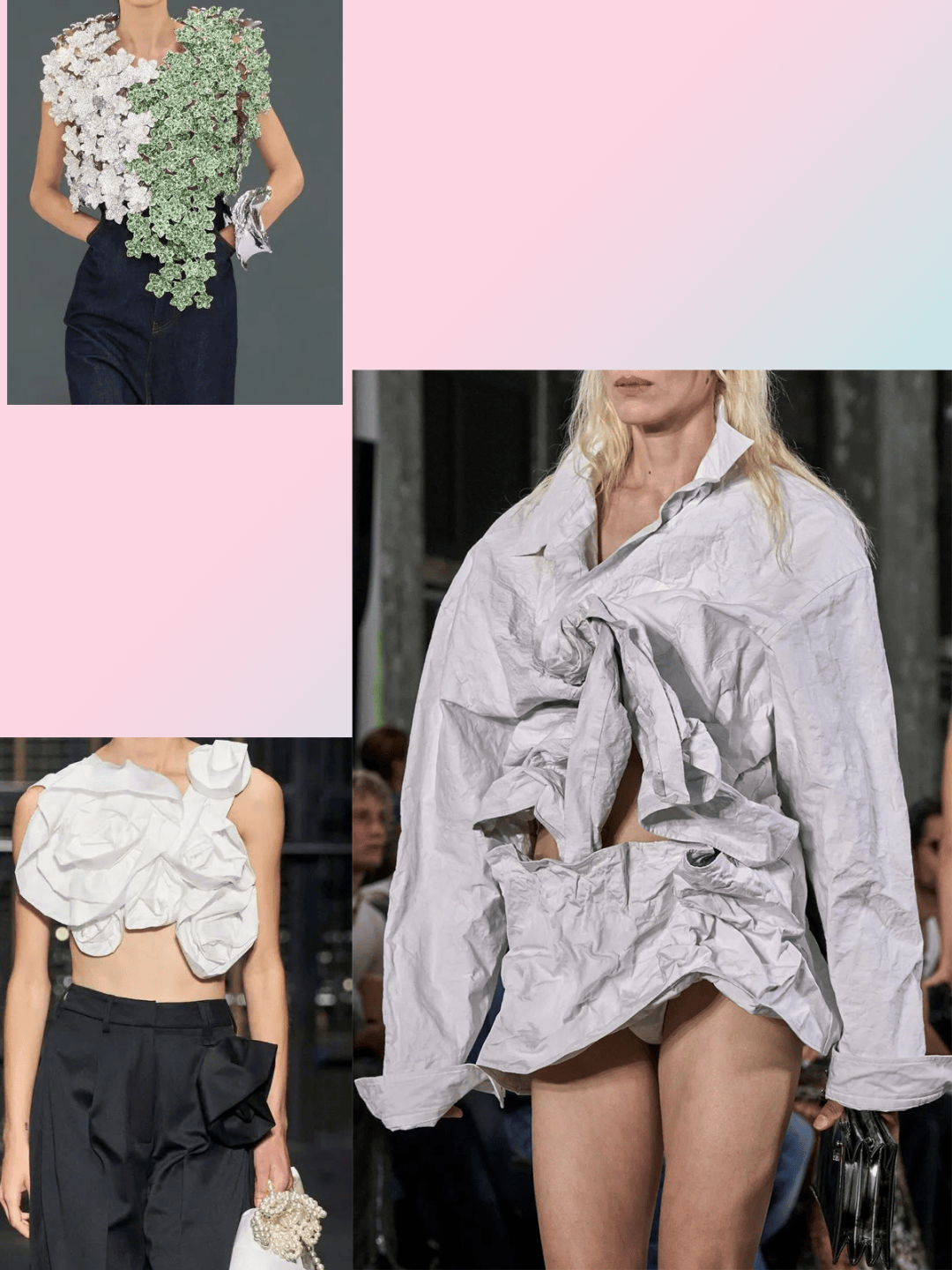 服装在这些上衣等款式的服装,在纯色的简约,色彩对比的冲击等这些时尚中,以褶皱等元素,也让服装多了一些纹理质感的潮流。