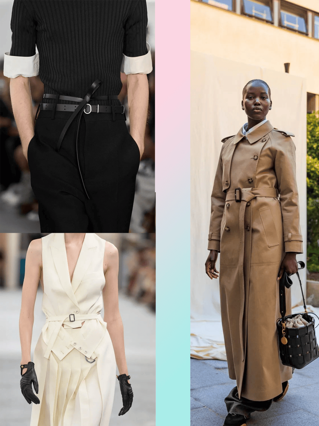 风衣外套、连衣裙、马甲等这些服装,以腰带进行搭配,在腰带的搭配中,多了一些修身收腰的柔和线条,腰带的出现也将不少的视线集中在腰部。