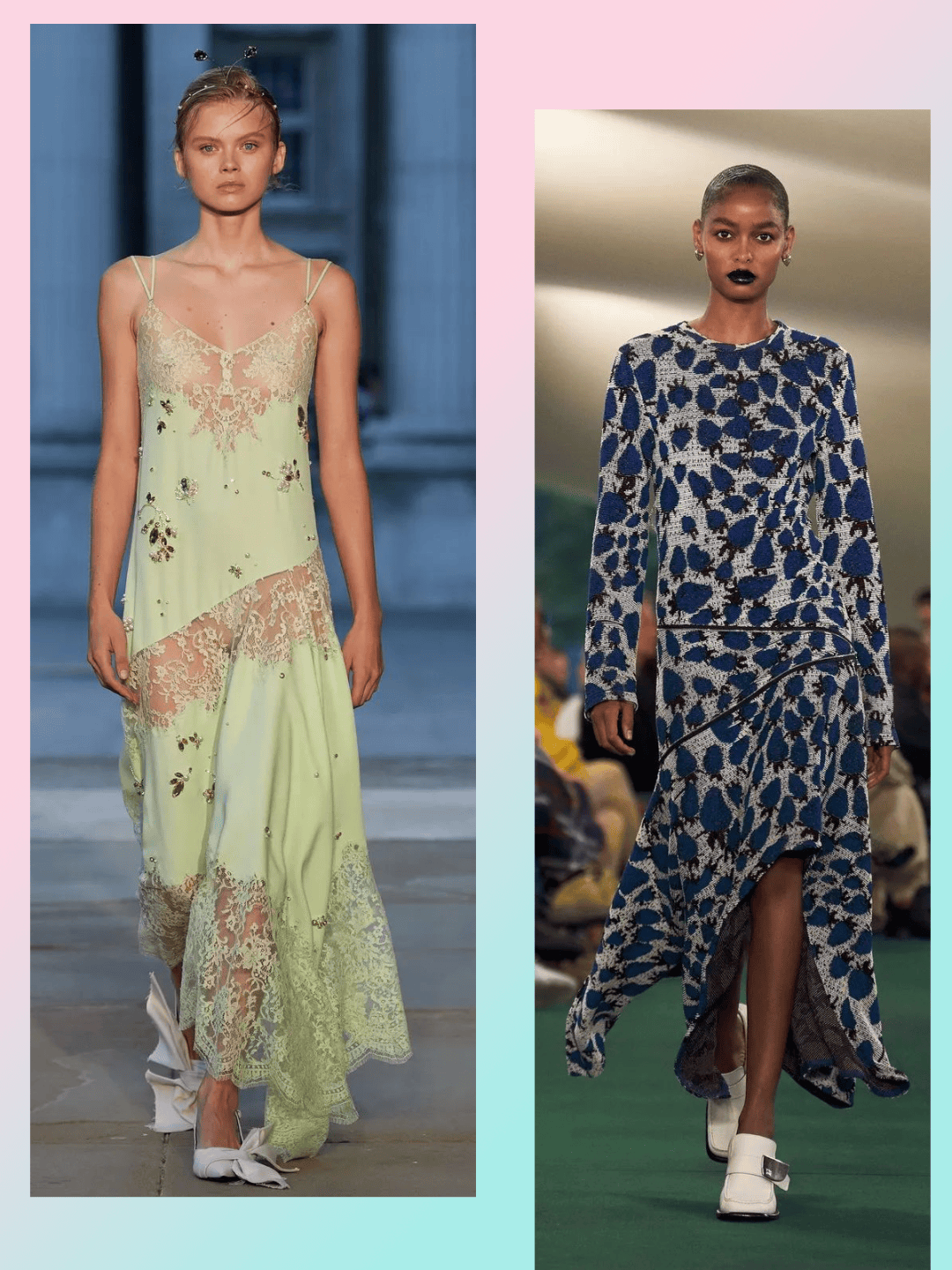 花纹图案在色彩的对比中,这些色彩差异还有图案的不同风格和气质的活力感,这些图案也和裙装结合起来,多几分优雅时尚,还有纹理质感的差异、不规则的裙摆、开叉下摆等设计。