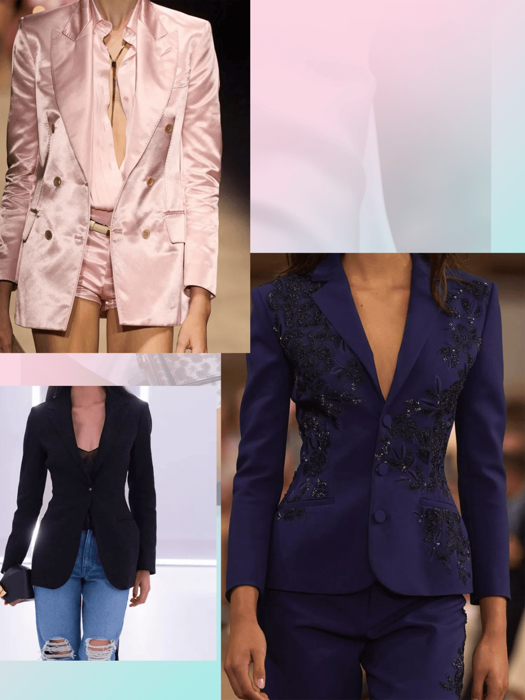 在西服元素的上衣中,这些西服款式让气质干练利落,也结合了花纹图案的装饰、修身廓形的柔和曲线等,这些设计的结合,细节也增加了不少的设计感。