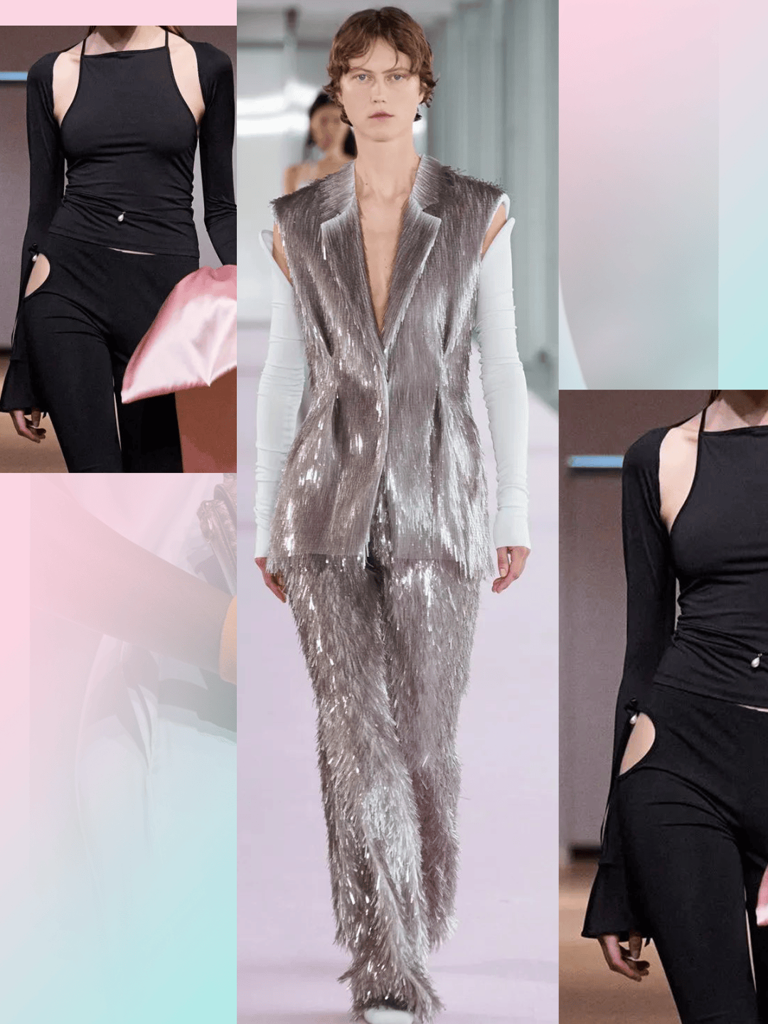 光滑的面料除了皮革之外,也有一些PU/PVC等这些面料,也结合一些镭射材质、金色、银色等,光滑材质和金银色彩的结合,还有几分奢华的华丽气质。