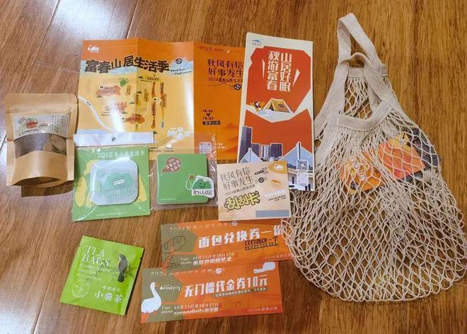 该礼包中还有“秋日尝鲜包”,内含养生茶、小袋茶,面包兑换券、无门槛代金券,另外还有一张“盲盒卡”,这些礼品都装进了秋日时尚网兜里。