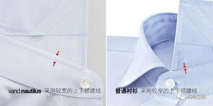 而参加对比的衬衫一致使用了较宽的上下领裥线,这样可以使得缝份骨位更加立体,上下领翻折更容易,着这种方式工艺相对复杂。