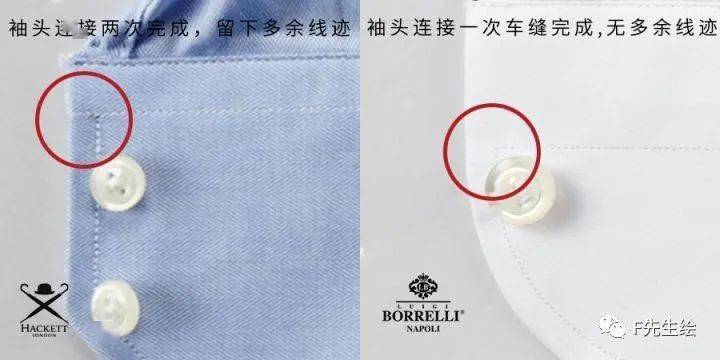高端衬衫为了追求克夫造型的完美,都采用一次车缝一气呵成。这个小小的外观区别使衬衫档次高下立判。