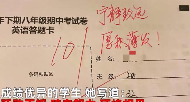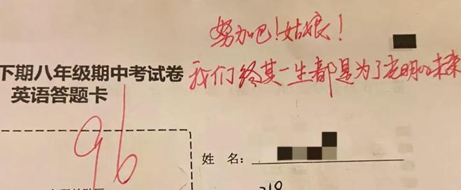 一个成绩不错的孩子在考试中发挥稳定,获得了105分的高分,女老师在她的答题卡上写下了一句很有力量的话:兵分两路,顶端相见!