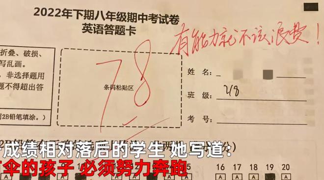 一个能力不错的孩子因为学习态度不好只考了78分,对此,女老师的评语也有些恨铁不成钢:有能力就不该浪费!