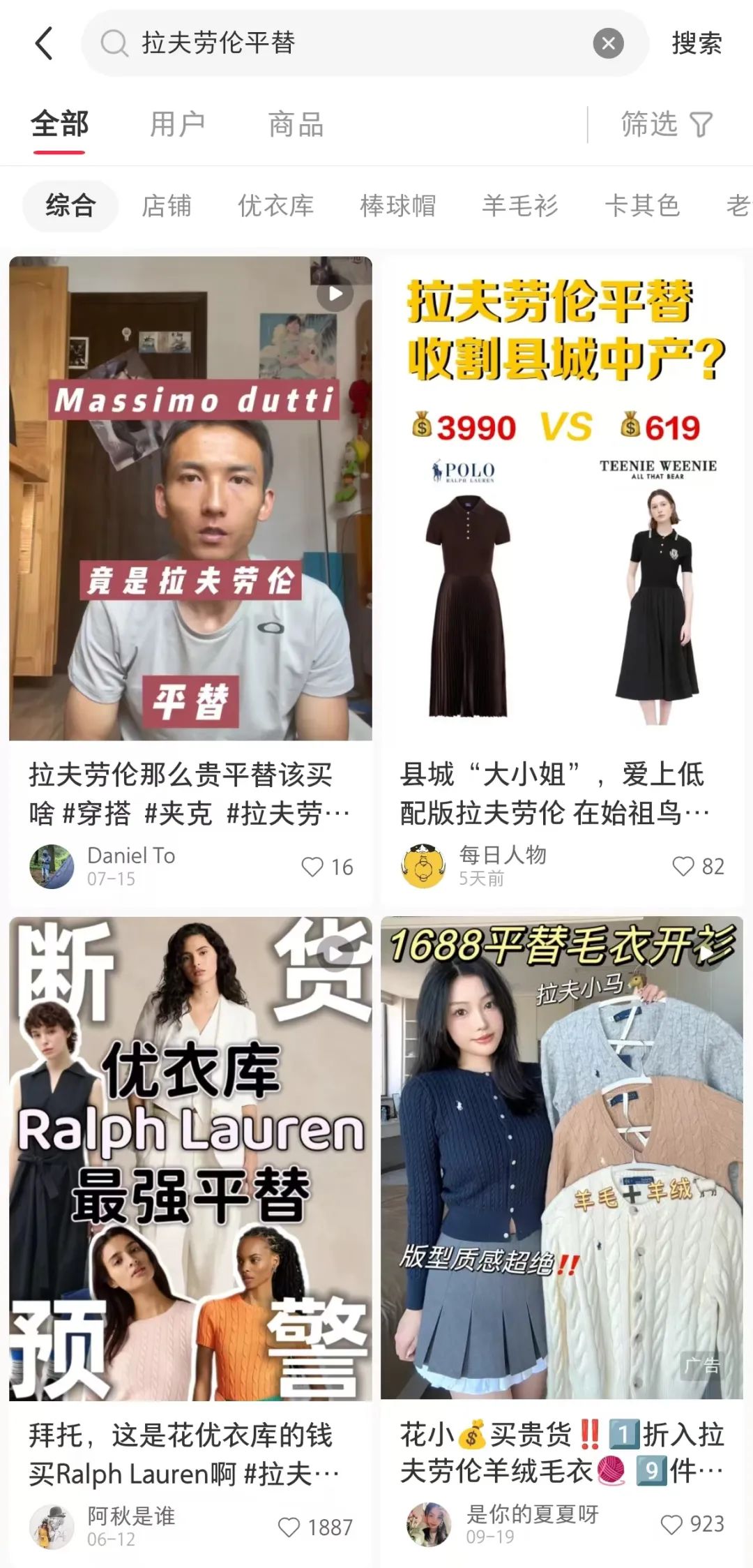 优衣库的衣服以质量好、耐穿、不起球、不褪色、不变形等特点著称,除了没有那个标志性的logo外,无论是款式还是质感都与拉夫劳伦相似。在1688、拼多多等平台上,价格从60元到200元不等的拉夫劳伦平替比比皆是。消费者们纷纷表示:“百元一件的平替拉夫劳伦,收到质量出乎意料,不比真的差。”