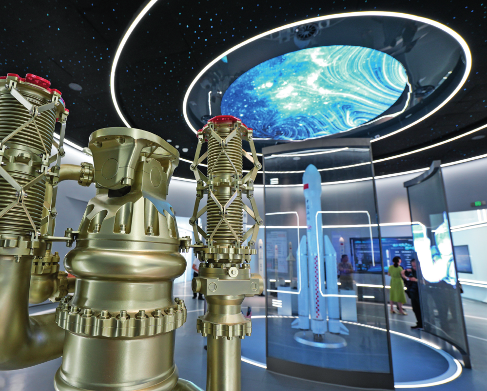 在无锡商业航天展示馆拍摄的火箭发动机模型(2024 年 9 月 9 日摄) 杨磊摄 / 本刊