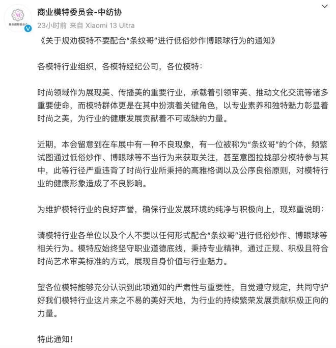 同时有网友扒出,此前@商业模特委员会—中纺协 曾发声明:《关于规劝模特不要配合“条纹哥”进行低俗炒作博眼球行为的通知》