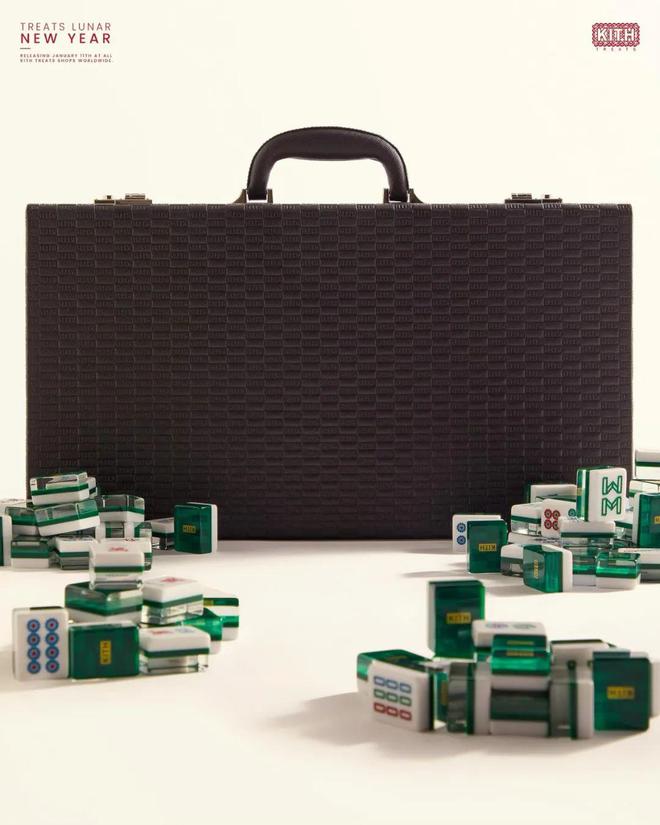 麻将箱由绿色Saffiano皮革打造,而每块麻将的背面也都是透明的Kith Monogram Box Logo,质感规格相当在线。