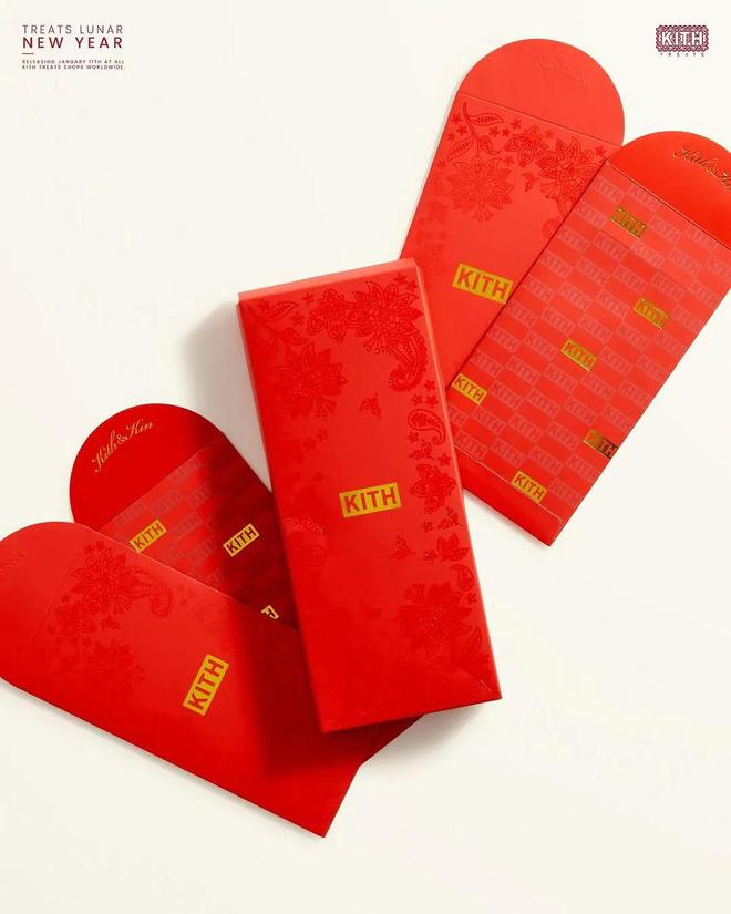 当然,配件也是一大看点,本次Kith还将推出一套10个封口印有金箔的Kith红包,一面是Kith经典的老花Box Logo,另一面则是腰果花纹样,属于是潮流圈新年塞红包必备款。