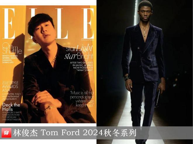 林俊杰,《ELLE》新加坡版2024年12月刊。深蓝色天鹅绒双排扣西服套装:Tom Ford 2024秋冬系列。