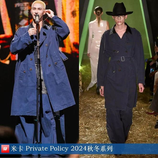 米卡,2025「一米」巡演长沙站。深蓝色双排扣风衣:Private Policy 2024秋冬系列。