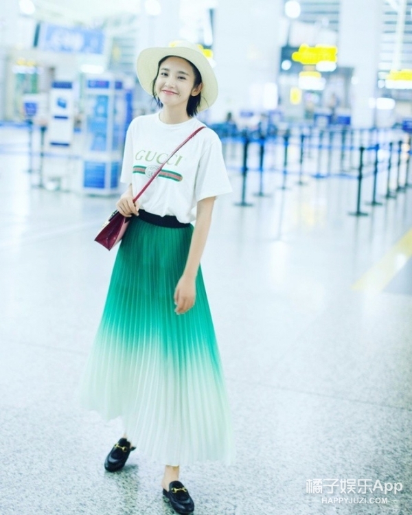 唐艺昕穿白色logo印花T恤搭配绿色渐变百褶半身裙,脚踩黑色拖鞋,笑容满分的她又双叒叕在机场走起了清新度假风!