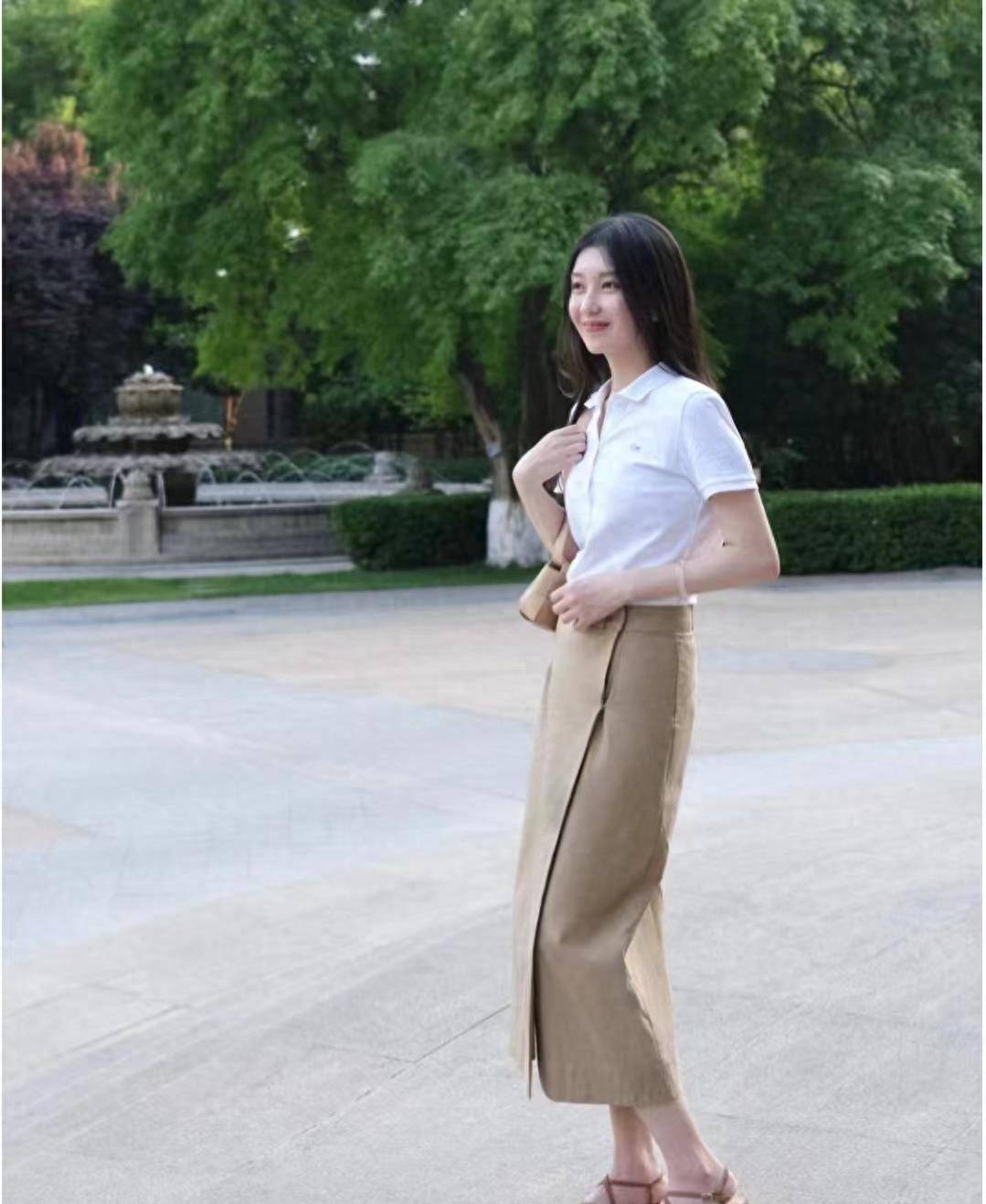 白色POLO衫搭配卡其色直筒裙+凉鞋。它看起来更年轻,也让腿看起来更长。它具有规则、灵活的设计和标准学生用书的外观。无论你在哪家公司工作,这都是不可否认的特质。旅行服装。