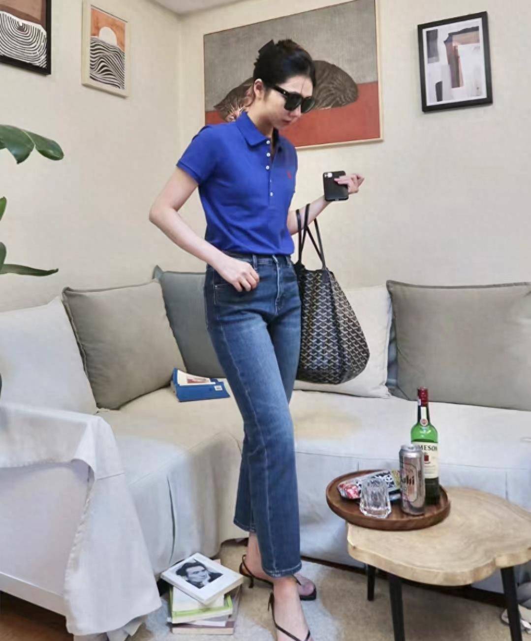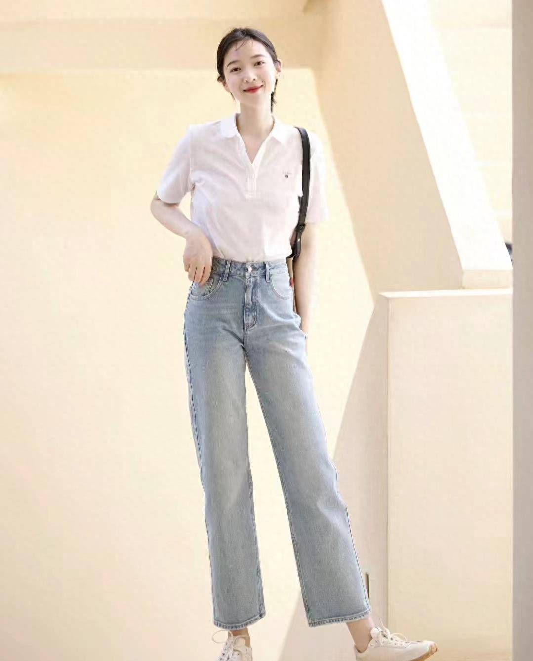 搭配不同深浅的蓝色:收腰Polo衫搭配直筒牛仔裤是打造梨形身材的显瘦方式之一。对于不喜欢把上衣穿在腰间的姐妹们,完全可以放心选择这种款式的polo衫。 。
