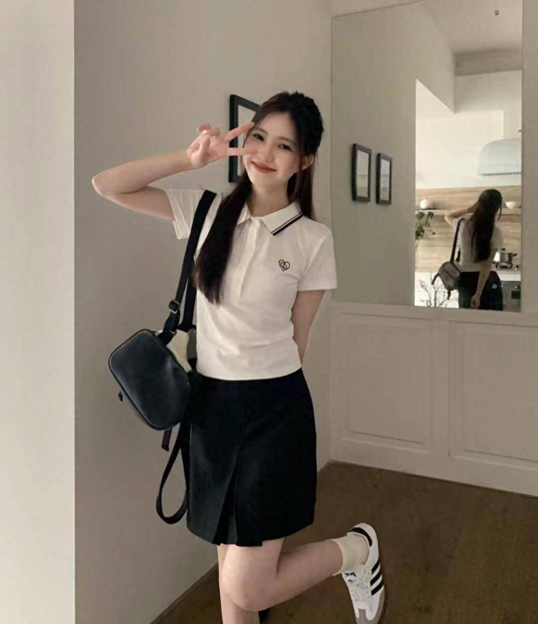 由薄薄的白色面料制成的 Polo 衫搭配黑色裙子。平静的色调结合在一起,表达出女性柔和、平和的本质。穿舒适的慢跑鞋适应现代都市生活。