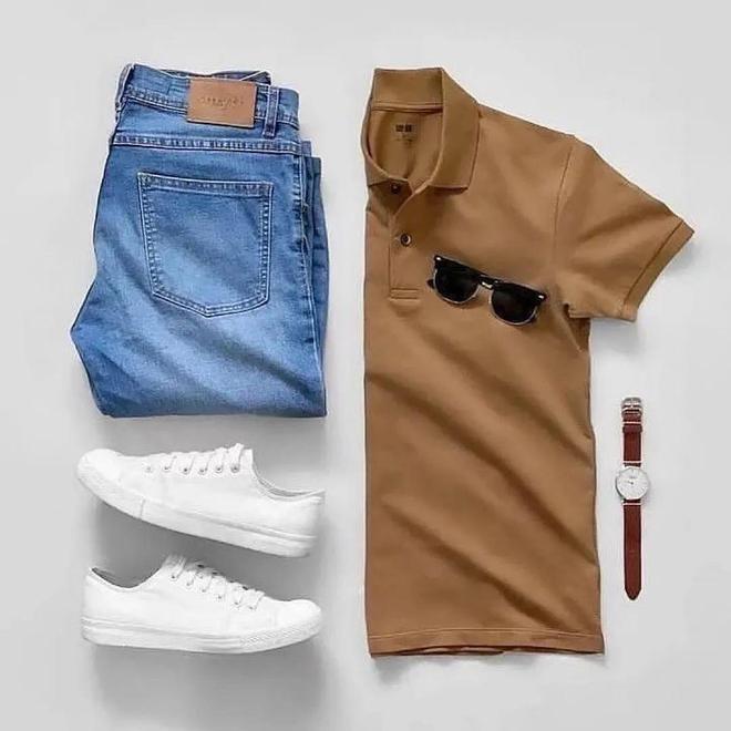 搭配要点:同色系的穿搭,可以减少配色上的错误,同样是深蓝系的polo衫和牛仔裤,整体穿搭很统一,穿上白色帆布鞋,瞬间打破了沉闷感,稳中带着帅气。