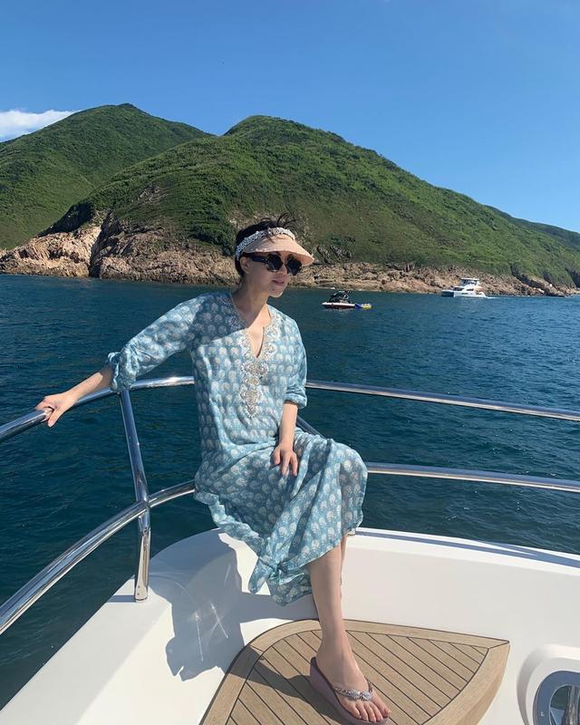 而吕良伟的妻子杨小娟同样是身材超级苗条。她穿着蓝色的纱裙,被轻柔的包裹着,蓝色与大海的蓝色融为一体,非常飘逸自在。领口的位置也是大V领,还加上了花边的装饰,既显脸小,又增加了雍容的气度。