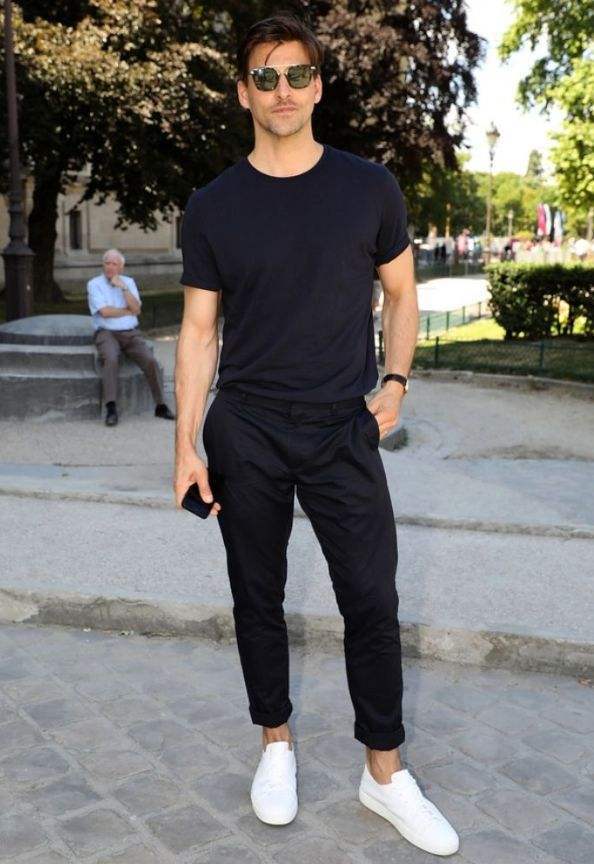 穿着黑色T恤和黑色裤子也能穿出时尚感,像图中模特一样,穿上简约的款式,配上黑色的皮鞋,再配一个黑色的手链,十分帅气。