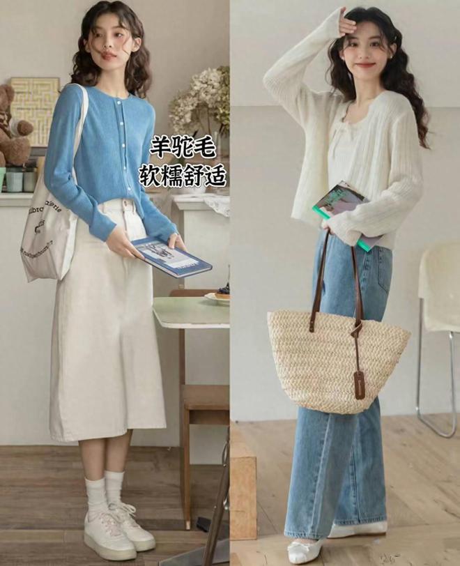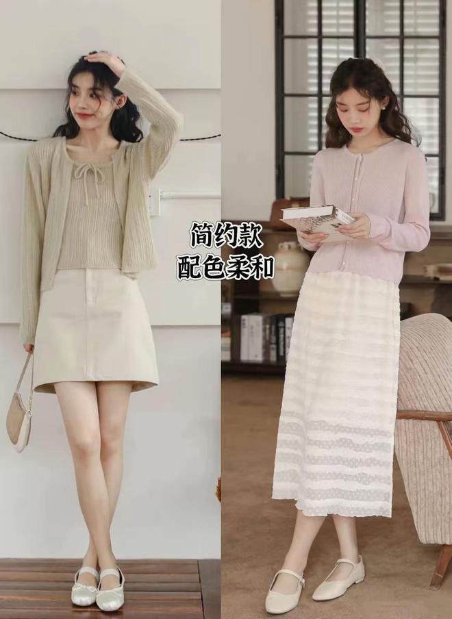 燕麦色的针织开衫、以及粉紫色的针织开衫,都格外的温柔。款式简约、穿起来不臃肿,更柔和自在。不管是配长裙、还是短裙,都格外的时尚。