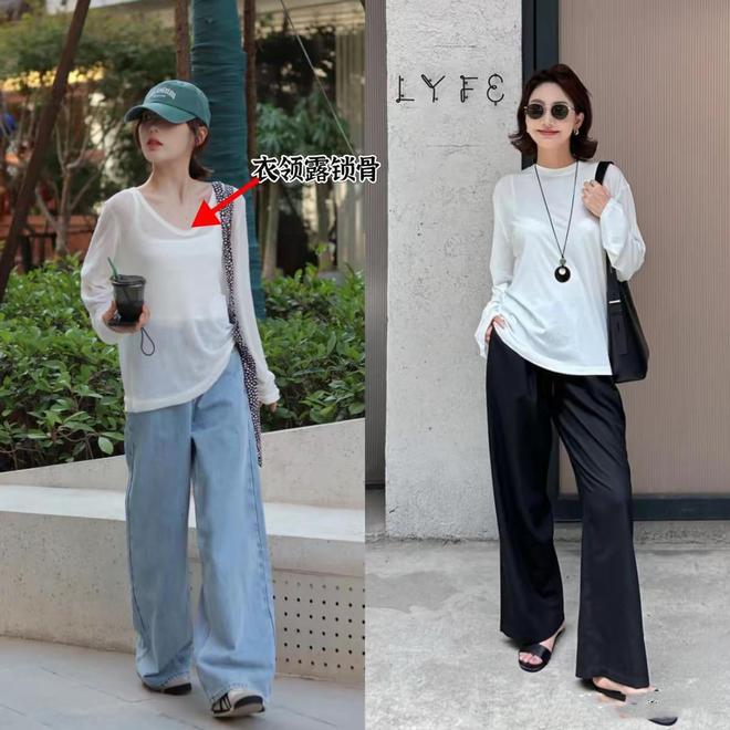 我们选择宽松T恤衫的时候,尽量搭配大领口的款式,露出锁骨线条在休闲风中多一点小性感。如果宽松T恤领口比较保守低调,可以尝试佩戴毛衣链增强时尚氛围。