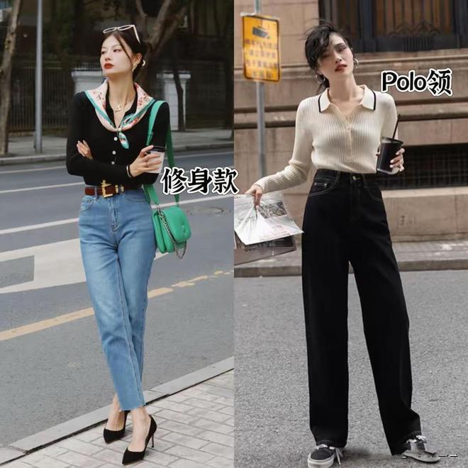 修身的黑色polo衫,配上高腰的微喇牛仔裤,简简单单的就很显高。如果你想要大长腿的效果,可以配一双高跟鞋,充分拉伸比例显腿长。