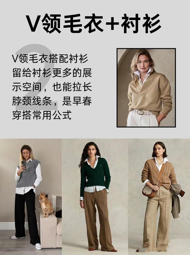 基础款的圆领毛衣,相对修身的款式,可以配更合身一点的衬衫。衬衫作为内搭,可以丰富层次感,时髦又得体,上班通勤也很有范。