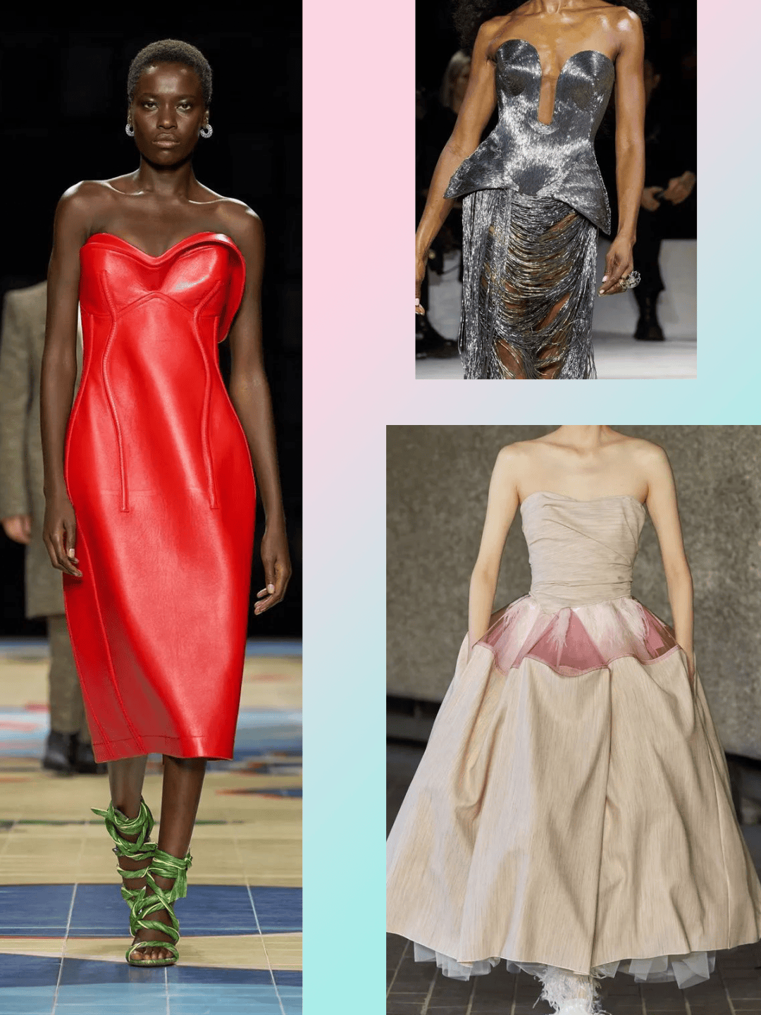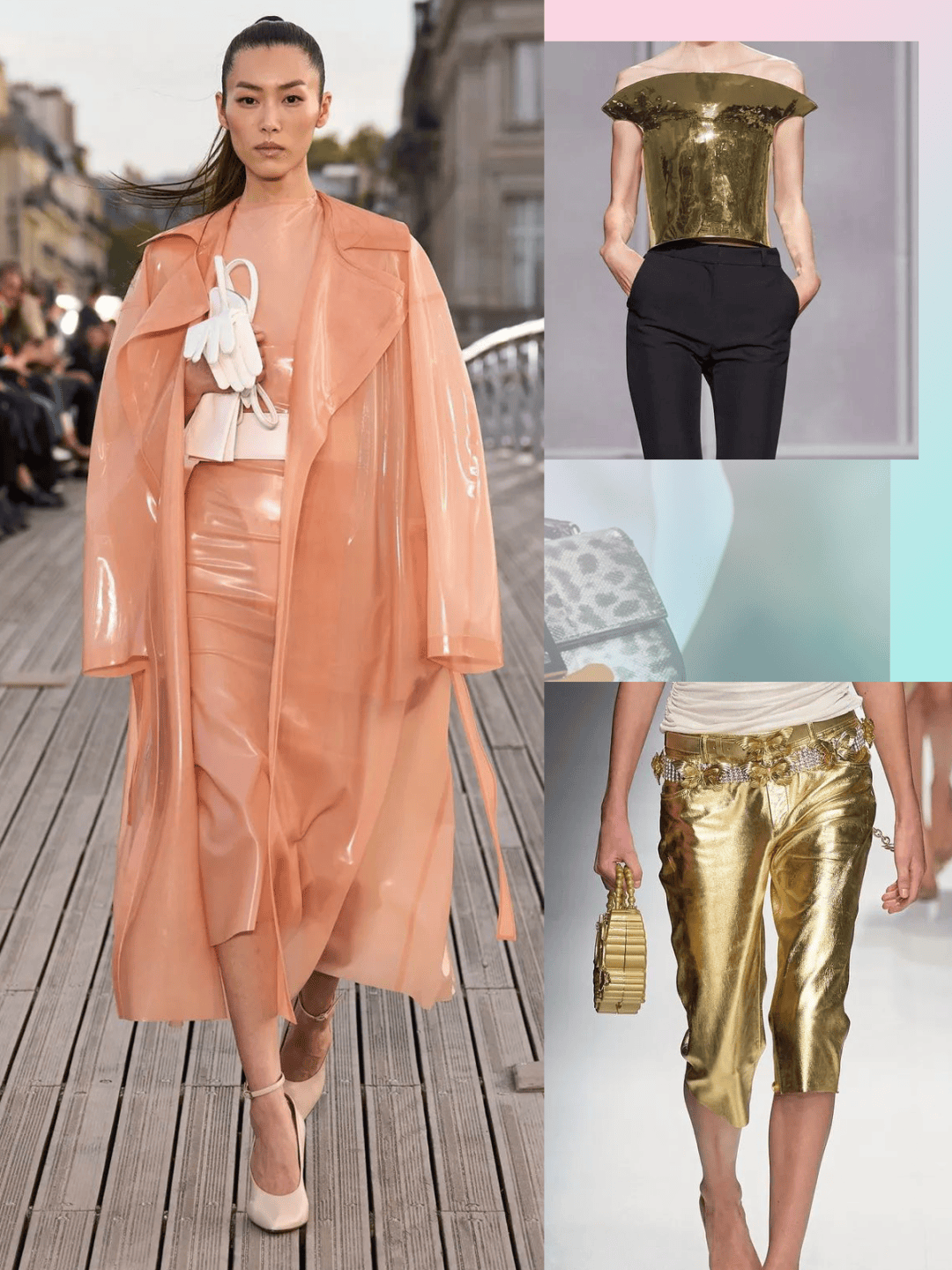 光滑的面料除了皮革之外,也有一些PU/PVC等这些面料,也结合一些镭射材质、金色、银色等,光滑材质和金银色彩的结合,还有几分奢华的华丽气质。