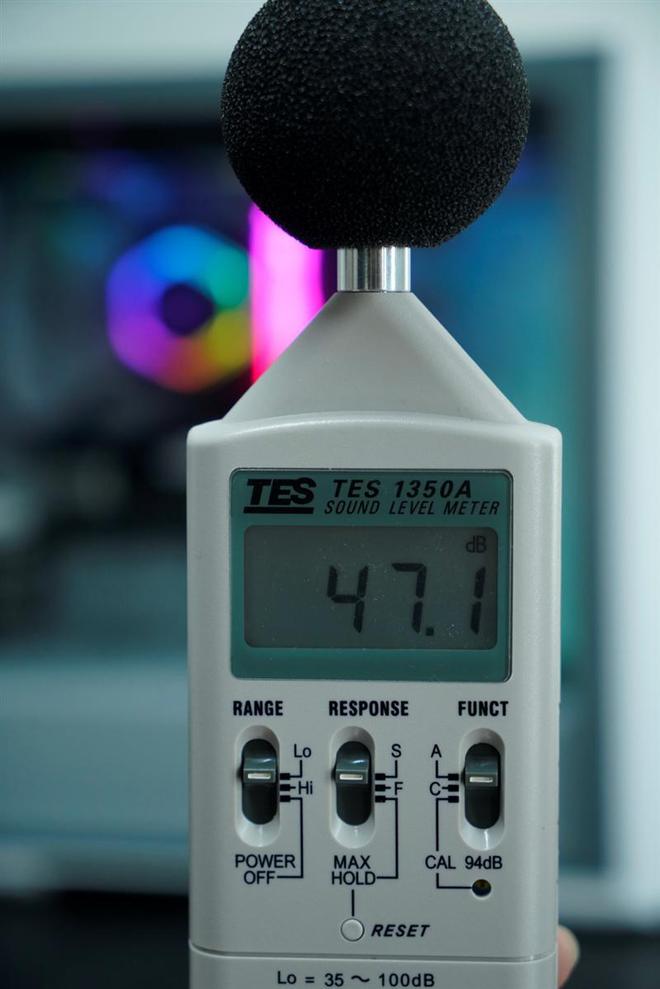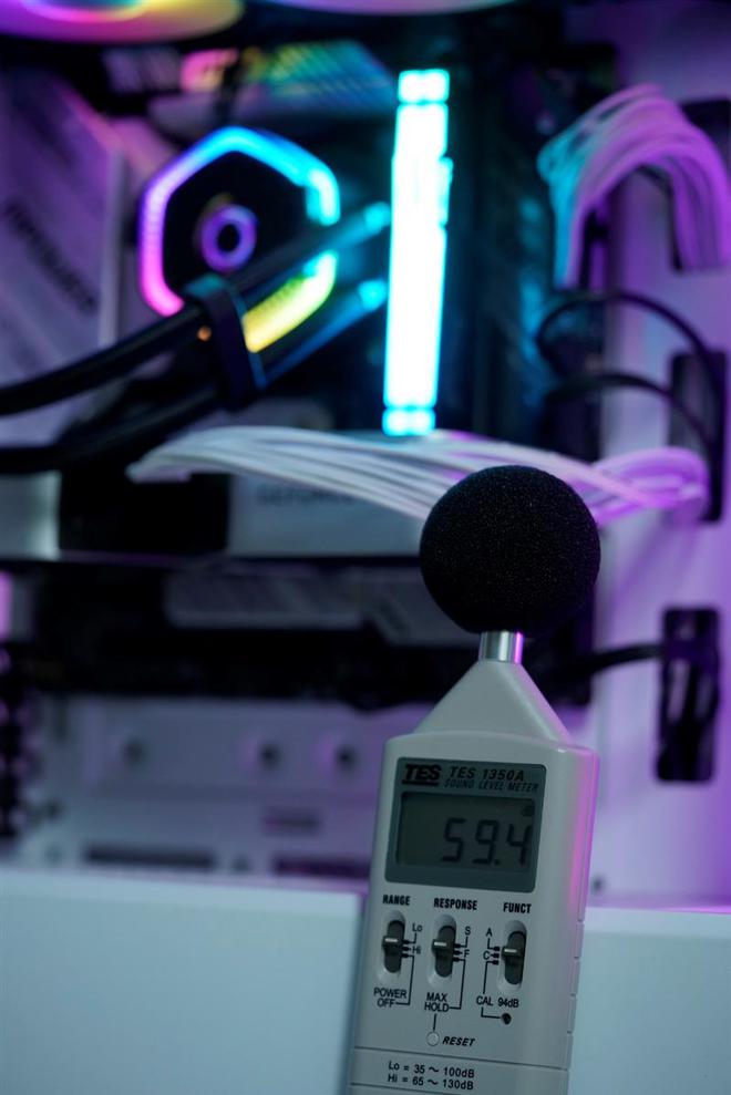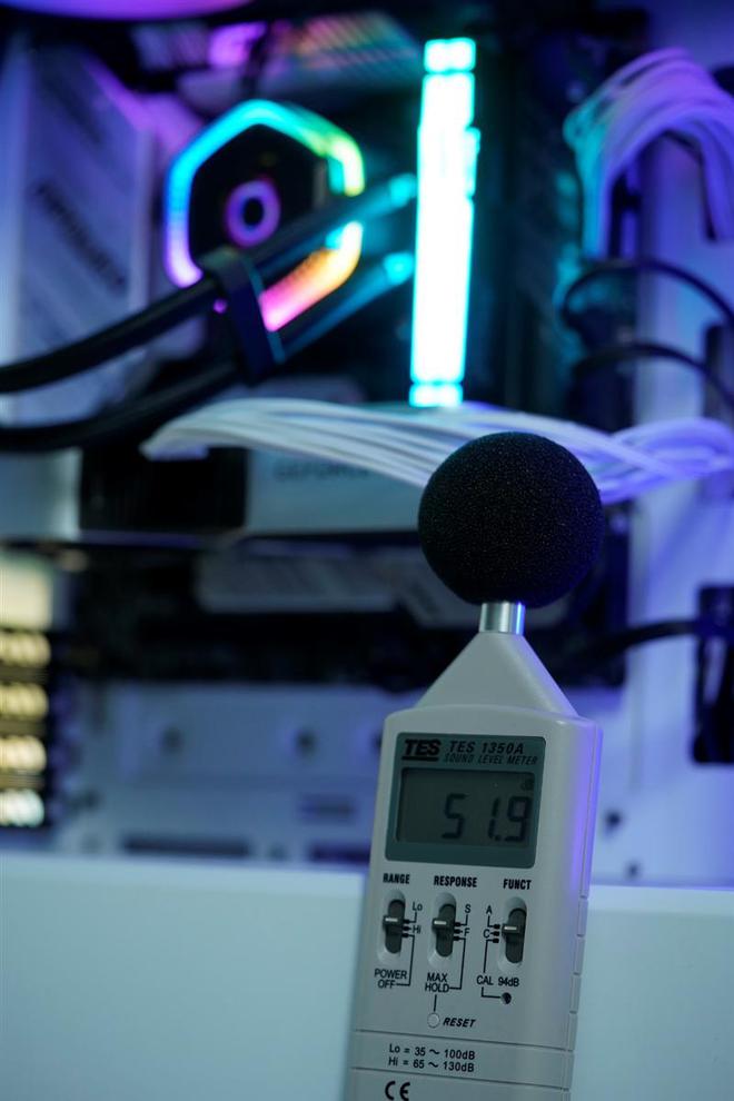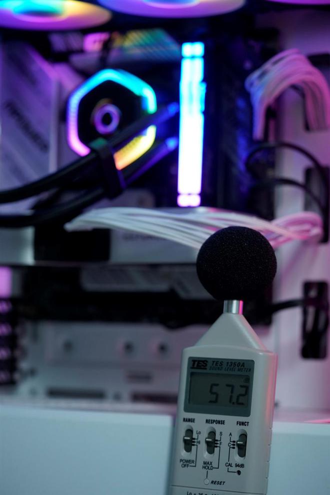把机箱的侧板打开,然后将噪音计直接靠在机箱上,距离水泵和冷排风扇直线cm,此时测量的结果实际上是远大于用户实际使用时的噪音感知的。