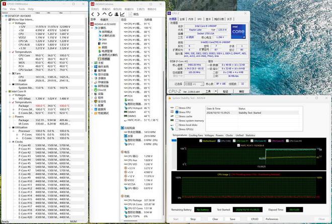 最后在主板BIOS中将CPU功耗限制解除,用AIDA64进行15分钟的极限FPU烤机测试,此时对散热系统负担极大,最终CPU稳定运行于320W-340W的功率上。