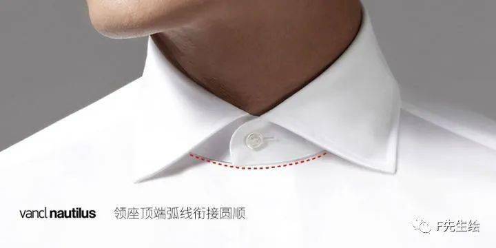 尽管正装衬衫不打领带且扣上第一粒纽扣的穿着情况很少见,但作为高级衬衫的重要要求,领座两端弧线圆顺的衔接起来是个不可少的。如下图: