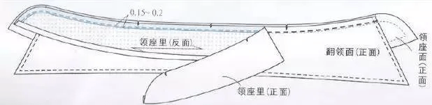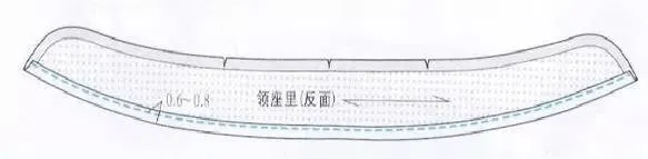 6、将领座里的领底弧线沿着衬布边沿向方面(烫有衬布的一面)扣烫平服,并在正面压缉0.6~0.8cm的明线、如图所示,将领座面、翻领、领座里依次叠放,对准肩点和后中心点,按照净样线cm缝头)车缝在一起。