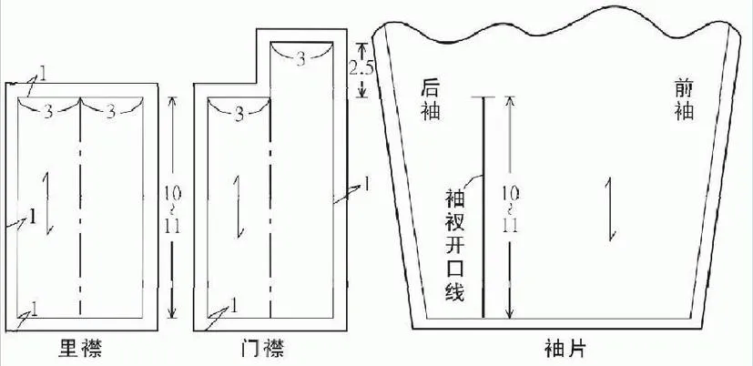 袖片:袖衩长为10~11cm。门襟:净样宽6cm,高10~11cm,宝剑头高出2.5cm,四周放1cm的缝头。